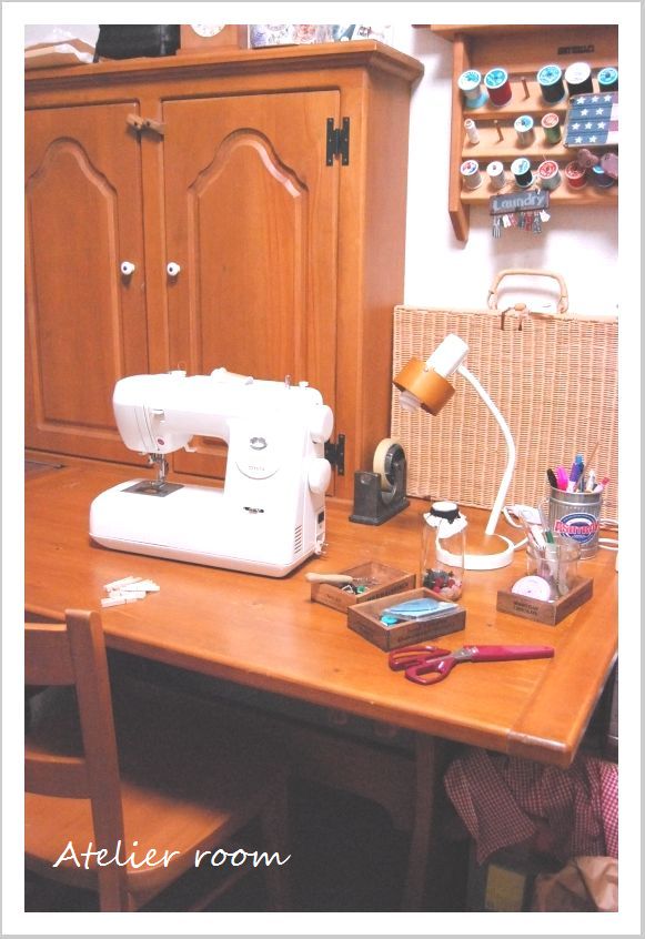 作業台のダイニングテーブルに生地やレースを収納しておく棚や糸掛け
