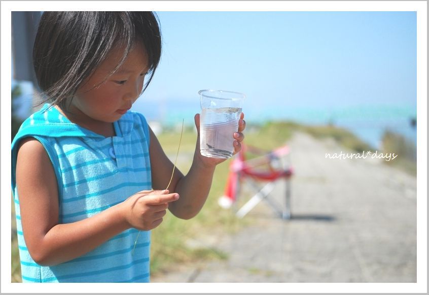 川で見つけたヤゴに夢中な あみりちゃん。
