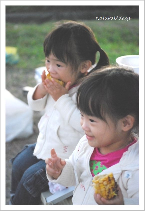 焼きもろこしにかぶりつく ふたごのりさちゃんとりおちゃん。