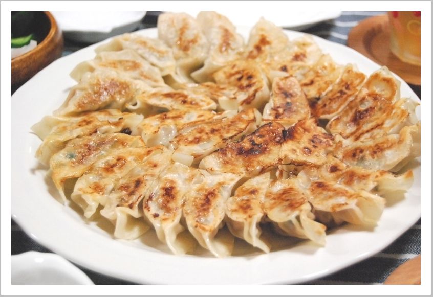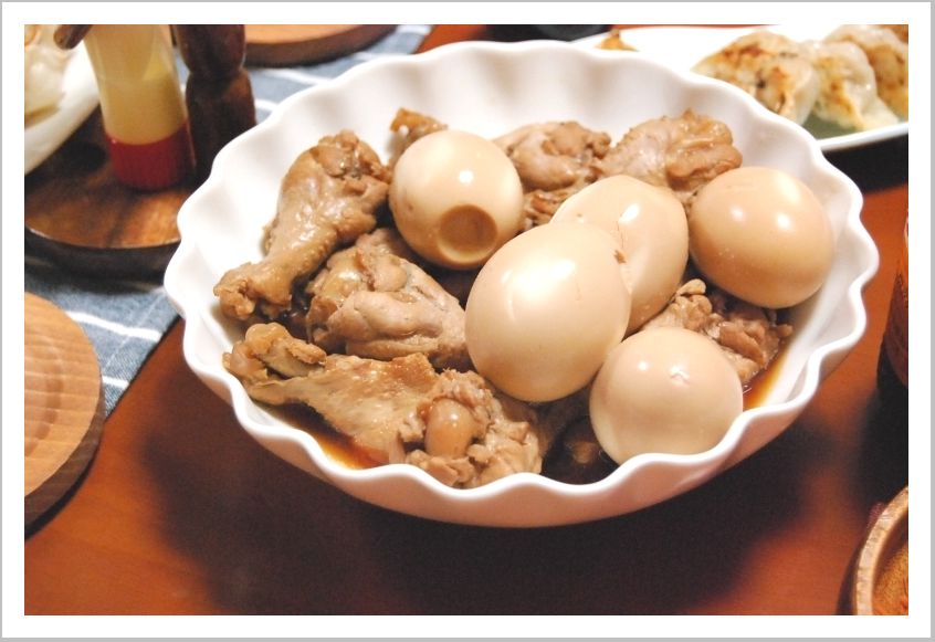 夕飯には餃子やお酢で煮た鶏肉と卵など盛りだくさん作ってくれて