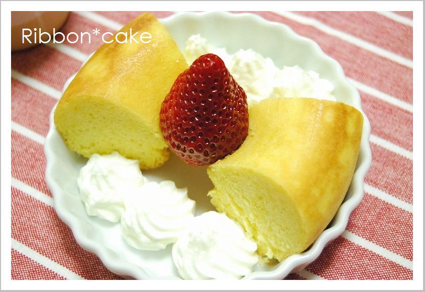 イチゴと生クリームを添えて リボンのケーキにしてみました♪