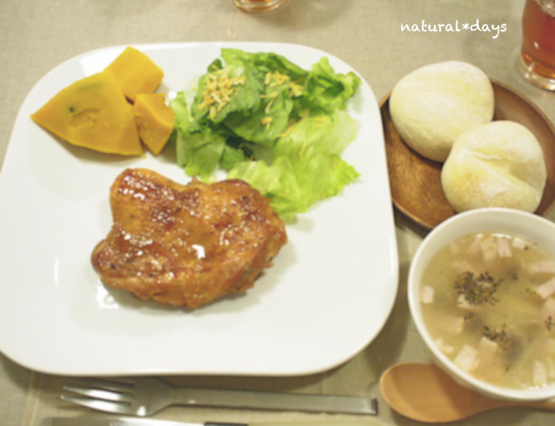 チキンの照り焼きとキノコたっぷりのスープとハイジの白パンとカボチャを蒸して